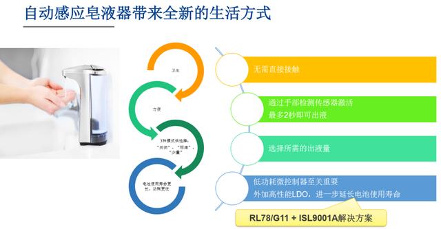 基于RL78/G11的自動感應(yīng)皂液器,該方案使用中速片上振蕩器時,RL78/G11可以從待機模式中快速喚醒,ISL9001A以低靜態(tài)電流驅(qū)動,從而保證了低功耗特性,同時該方案增強了模擬功能降低了BOM成本,從而滿足了用戶對自動皂液器的三個主要要求:低功耗、長電池壽命、低成本。