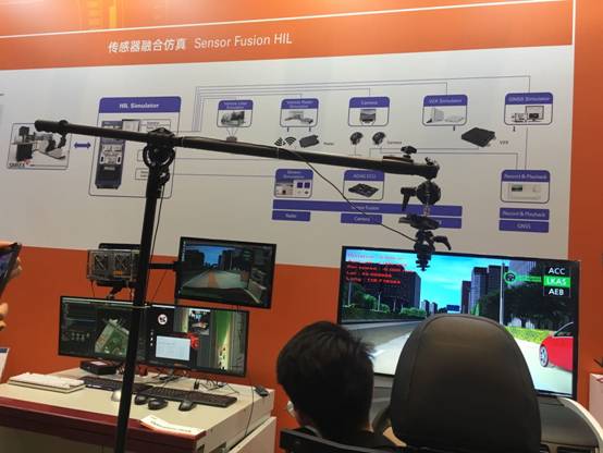 DEMO展示區(qū)的硬件在環(huán)(HIL)實時測試系統(tǒng)有很好的兼容性及可擴(kuò)展性,支持與不同場景仿真軟件進(jìn)行交互,并可將模型運行在實時系統(tǒng)和 FPGA 終端上??捎糜贏DAS 測試,傳感器融合測試,雷達(dá)測試,V2X 測試,編隊算法測試,路測等領(lǐng)域。